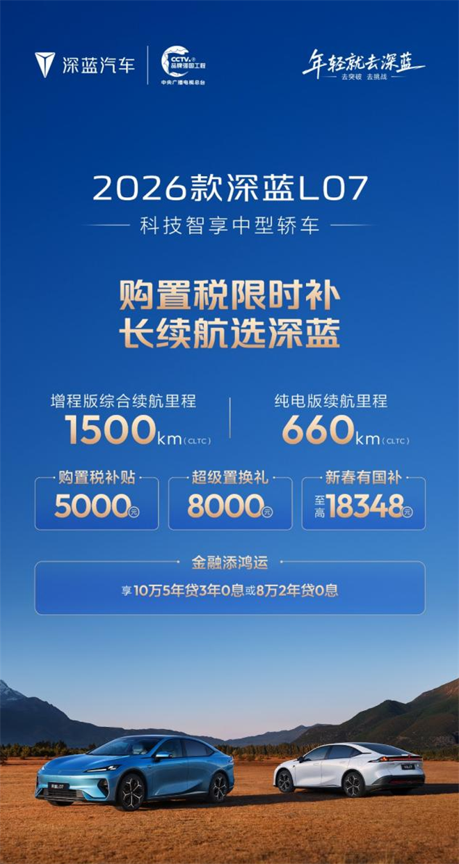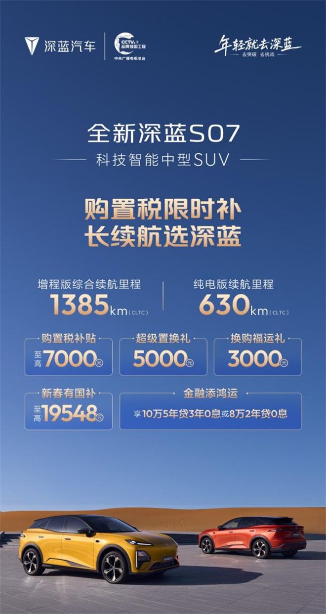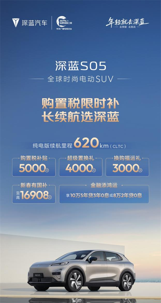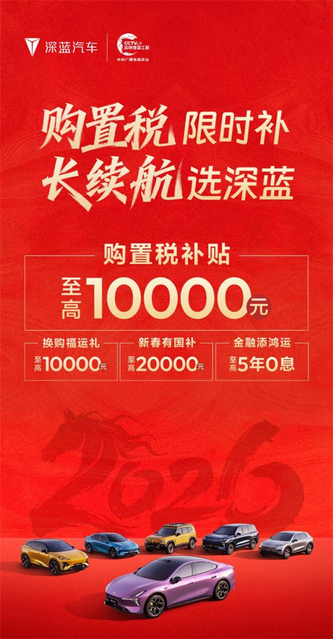 馬年行好運(yùn),新春購(gòu)新車。春節(jié)前夕正值購(gòu)車政策紅利期,選擇深藍(lán)汽車,也就意味著將同時(shí)獲得 “央企品質(zhì)保障、長(zhǎng)續(xù)航核心優(yōu)勢(shì)、全系限時(shí)補(bǔ)貼” 三重利好。2026,和深藍(lán)一起,即刻煥新座駕,解鎖新春出行新體驗(yàn)!