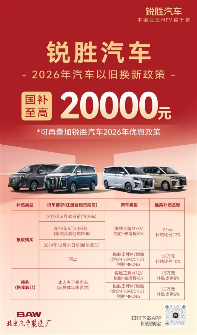 具體而言,銳勝汽車2026年以舊換新政策為消費者提供了兩條清晰的路徑。一是“報廢更新”,即對達到規定使用年限的老舊機動車進行合規報廢后購買新車;二是“置換更新”,即通過市場交易轉讓名下舊車后再購置新車。這意味著,家中那臺可能已進入“退休”狀態的舊車,其剩余價值被政策激活,最高可補貼20000元的購車資金,大幅度降低了購入銳勝M8的經濟門檻。