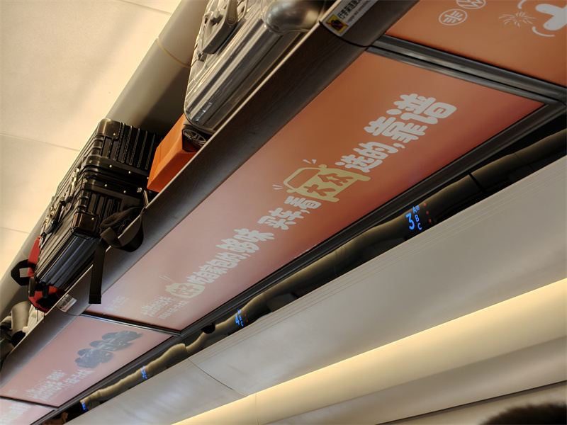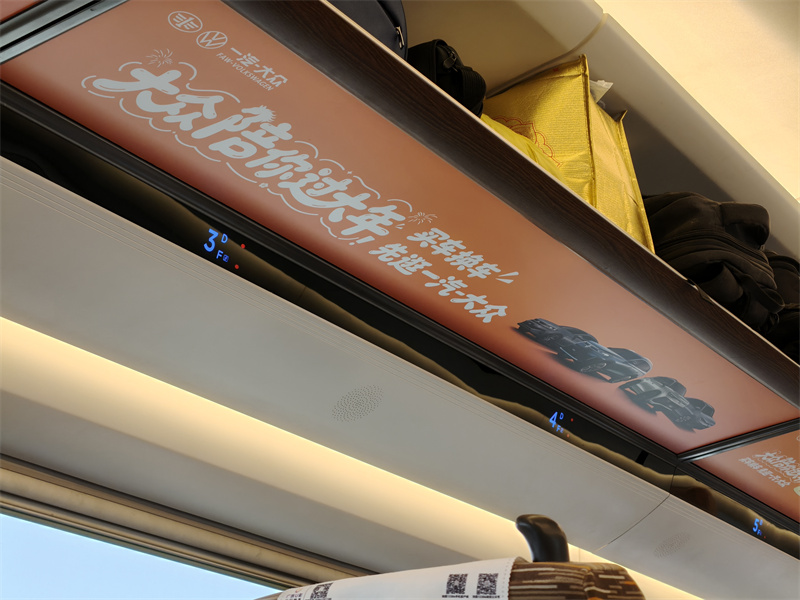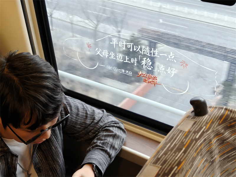 不止窗花吸睛,整列列車都藏著小驚喜!行李架上的一汽-大眾品牌廣告,用大字報式的趣味表達打破刻板印象,簡潔有力又自帶記憶點;趣味天幕與車廂布置相映成趣,讓原本單調(diào)的高鐵旅途,變成了沉浸式的新春打卡現(xiàn)場。不用刻意尋找,目之所及皆是年味,隨手一拍都是氛圍感大片,讓趕路的人忍不住停下腳步互動分享,把旅途的美好定格。