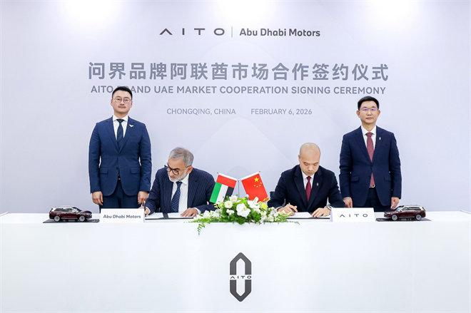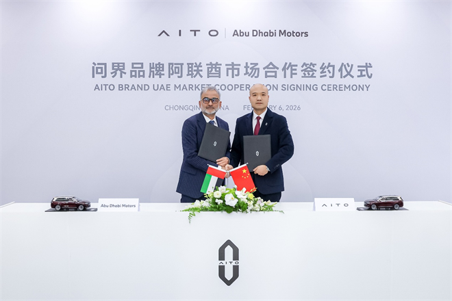 2026年2月6日,中國豪華汽車引領者AITO問界與阿聯酋頭部豪華汽車經銷商集團 Abu Dhabi Motors(以下簡稱 ADM)在中國重慶正式簽署戰略合作協議。賽力斯汽車海外BU總裁王進與ADM CEO Syed Faiz Karim 代表雙方簽署協議,賽力斯汽車總裁何利揚與阿卜杜拉·本·穆罕默德·本·布蒂·阿勒哈米德閣下私人辦公室中國區負責人趙頔見證簽約。這次合作標志著AITO問界在海外高端新能源市場的布局取得關鍵進展,正式開啟品牌全球化的新篇章。