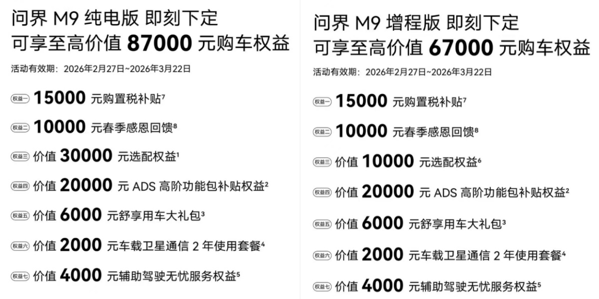 值此春日出行季,問界M9更推出限時購車重磅禮遇。即日起至3月22日,下定問界M9至高可享87000元購車權益,涵蓋購置稅補貼、春季感恩回饋及ADS高階功能包補貼等多重福利,以真金白銀的優惠,讓觸手可及的科技豪華,陪伴每一位用戶奔赴春日山海,解鎖更多出行美好。