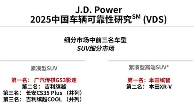 據中國汽車質量網統計,影速自2023年至今一直穩居自主品牌小型SUV質量冠軍,在《J.D.ower2025中國車輛可靠性研究(VDS)》 中,影速榮獲緊湊型SUV可靠性第一名;在《J.D.Power2025中國汽車產品魅力指數研究(APEAL)》 中,影速同樣位列緊湊型SUV榜首,這意味著用戶在實際用車中,對其設計、性能、智能化及駕駛感受給予了極高的評價。