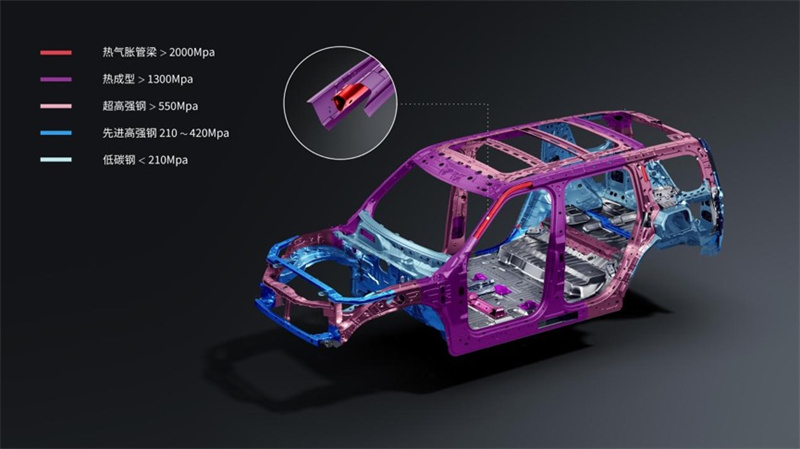 戰甲車身采用超高強度籠式安全結構,上車體20個關鍵環狀結構搭配下車體四縱十橫非承載式設計,構建起堅不可摧的車身框架;全車高強度鋼占比超83.2%,2000MPa熱成型材料使用長度達12.48m,均為行業頂級水平。其中,1500MPa一體式熱成型門環、1500MPa A柱內板、2000MPa A柱內嵌熱氣脹管梁,不僅將A柱障礙角縮減至4.15°,提升駕駛視野,更能在正面、側面碰撞或頂壓時有效防止座艙形變;2000MPa雙車門防撞板、9孔加強門檻梁,進一步強化側撞和翻滾防護,給車內人滿滿的安全感。