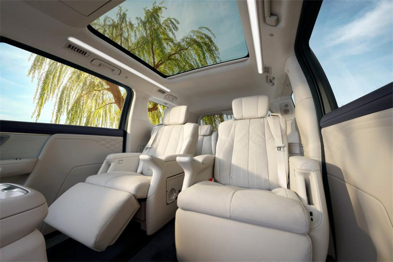 舒適配置拉滿,三排全粒面Nappa真皮座椅,二排多姿態零重力座椅支持聯動貴妃榻,8場景指壓式按摩,長途乘坐不疲憊。云臺式超低空氣懸架,車身降低60mm,355mm超低門檻,老人小孩上下車更便捷。