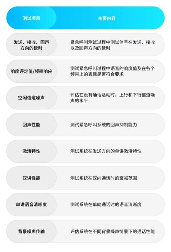 針對緊急呼叫的核心通信需求,開展信號延時、響度、頻響、空閑信道噪聲、回聲性能等多項目測試,同時聚焦免提通話與音頻質量核心指標,確保救援人員與車內人員在碰撞后能夠實現“聽得清、無干擾”的清晰溝通。