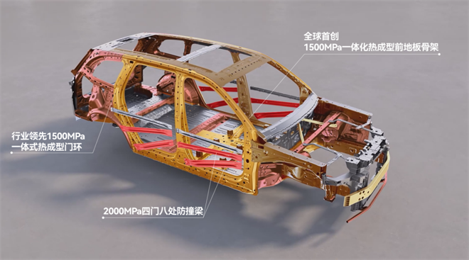 在車身材料及結構方面,華境S整車高強鋼及鋁合金占比超過85%,其中近30%為熱成型超高強鋼,為車身安全奠定了堅實基礎。針對側面撞擊的薄弱環節,華境S采用了與寶鋼共創的1500MPa一體式熱成型前地板骨架,以及1500MPa一體式熱成型門環,搭配十宮格結構的擠壓鋁門檻加強梁,同時在四門八處增設2000MPa車門防撞梁,堪比潛艇用鋼,大幅提升了車身側面的抗沖擊能力,讓側面防護堅不可摧。在此超高強鋼材質和一體式結構基礎上,華境S進一步采用五縱十一橫六環籠式車身結構,使車輛無論是在承受高速撞擊的單點暴力沖擊,還是在不規則跌落翻滾中的多維扭曲力時,都能確保車身框架的完整性與電池包的安全。