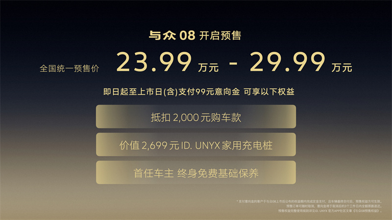 2026年3月26日,金標大眾家族的首位旗艦成員與眾08正式開啟預售,預售價格23.99萬元起,這波操作,可以說是大眾汽車以“中國速度”交出的又一份驚艷答卷。