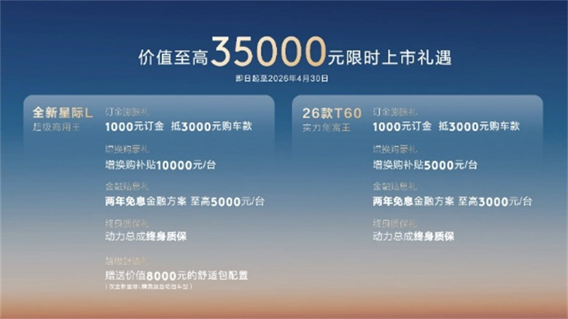 全新星際L,10.88-15.98萬元;26款星際EV,24.98萬元;26款T60,7.98-10.18萬元。三款車覆蓋商用創(chuàng)富、專業(yè)作業(yè)、日常通勤全場景。而且到4月30日前下訂,綜合權益至高3.5萬元。7萬出頭就能開走一臺正經(jīng)皮卡,這價格放在五年前,想都不敢想。