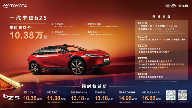 純電車型bZ5在4月推出限時權益加碼,置換權益升級為不限品牌廠補8000元,更可疊加9000-14600元的國家置換補貼,550JOY車型疊加廠補及國補后,限時權益價低至10.38萬元。金融權益也是誠意滿滿,0首付3年0息,低月供5年0息,降低購車門檻(置換、金融二選一)。同時匹配免費充電樁、500元電卡、非營運車主三電終身質保及電池三兜底保障政策,為后續用車提供安心保障。4月購車用戶還可免費獲贈天窗遮陽簾,舒適加倍。