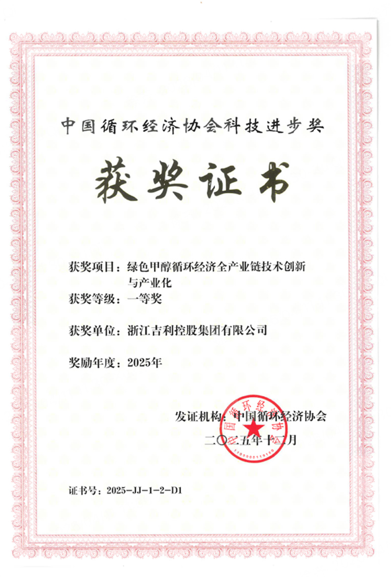 值得一提的是,由吉利控股集團主導(dǎo)的“綠色甲醇循環(huán)經(jīng)濟全產(chǎn)業(yè)鏈技術(shù)創(chuàng)新與產(chǎn)業(yè)化” 項目,于今年3月榮獲 “中國循環(huán)經(jīng)濟協(xié)會科學(xué)技術(shù)獎”科技進(jìn)步獎(技術(shù)開發(fā)類)一等獎,這一權(quán)威獎項也標(biāo)志著吉利在推動能源多元化、構(gòu)建循環(huán)經(jīng)濟產(chǎn)業(yè)鏈方面的探索獲得高度認(rèn)可。