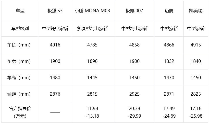 要知道,這個尺寸不僅比市面上多數熱銷的10萬級純電家轎大一圈,甚至超越了凱美瑞、邁騰等經典燃油B級車。這意味著,以前要花二十萬才能擁有的中型車空間,現在極狐S3用10萬級就給你了。即便把它和不少熱門中大型轎車放在一起,尺寸也基本相當。
