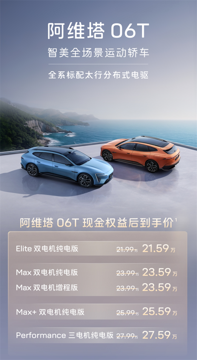 2026年4月22日,阿維塔科技正式發布了旗下全新運動轎車——阿維塔06T。官方售價21.99萬元-27.99萬元,限時權益后到手價21.59萬元-27.59萬元,推出純電、增程兩種動力共五款車型。從定價到配置,這款車釋放出一個明確信號:阿維塔不再滿足于做“高端智能電動車”的跟隨者,而是試圖用“6T產品價值”重新定義年輕人對性能車的想象。