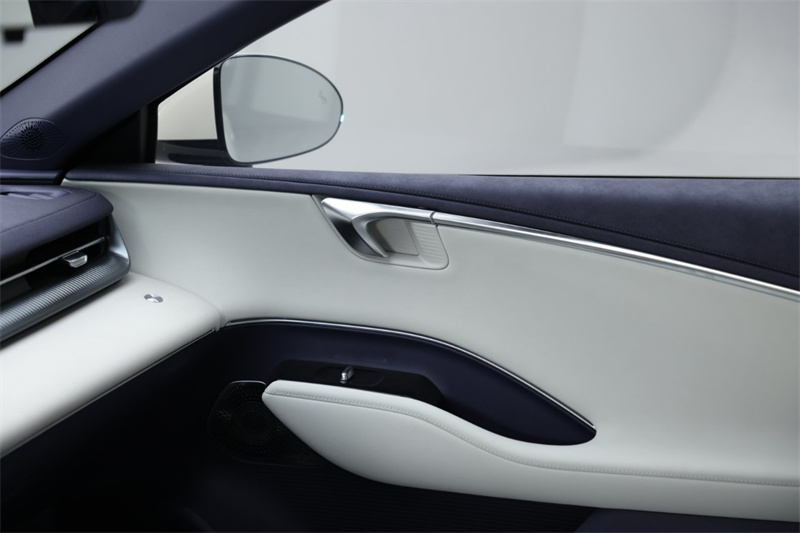 進入車內,“揚帆映云”內飾同樣令人驚艷。門板及座椅采用蜀錦質感的軟包覆,配合三維立體網孔3DMesh技術,營造出輕奢而溫馨的座艙氛圍。全車軟包覆面積達8.68㎡,門板采用仿麂皮與珠光皮革雙拼材質,冬季不冰手、夏季不粘膚。256色全域氛圍燈隨心而變,讓每一次出行都充滿儀式感。