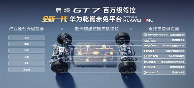 駕控部分,啟境GT7首發華為乾崑赤兔平臺,把智能軟件、頂級硬件和國際大師調校原生融合。前雙叉臂后H臂多連桿全鋁懸架,簧下質量輕20%,標配閉式雙腔空氣懸架加連續阻尼可調減震器,再加上大陸四活塞卡鉗和倍耐力輪胎,百公里制動距離壓進33米內。HUAWEI XMC數字底盤實現六域毫秒級協同,剎車不點頭、過坑更平穩,三電機系統讓零百加速達到2.98秒,直接躋身2秒俱樂部。