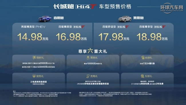 “真新能源皮卡”硬核登場。4月24日,北京車展上,全球智能電混皮卡長城炮Hi4-T重磅開啟預售。本次預售推出多款配置車型:商用炮兩驅精英型PHEV官方預售價格為14.98萬元,商用炮四驅精英型Hi4-T官方預售價格為16.98萬元,乘用炮四驅舒適型Hi4-T官方預售價格為17.98萬元,乘用炮四驅尊享型Hi4-T官方預售價格為18.98萬元。購車即可享受六重大禮:10000元置換補貼、至高7萬24期0息金融禮、三電系統終身質保服務禮、充電禮、互聯禮,此外,商用炮預售期限時下訂贈送價值2000元全車AT胎,乘用炮預售期限時下訂贈價值5000元后橋差速鎖,誠意拉滿。