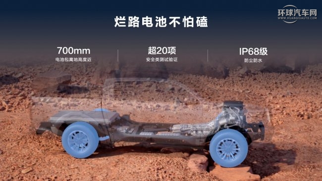走碎石泥濘爛路,車輛電池不怕磕。長城炮Hi4-T創新電池布局,電池包安裝在車輛大架后段橫縱梁內,離地高度近700mm,底部還有PVC防護涂層,走碎石路、涉水路段,不用擔心電池托底、磕碰、進水。電池經過二十多項嚴苛安全測試,達到IP68級防塵防水標準,長期用車安心。