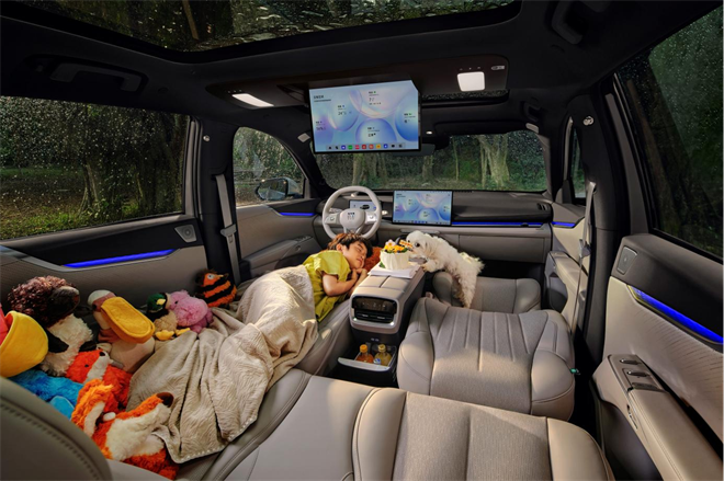 內飾則以東方扇面為靈感,水晶折扇可化為圓桌、屏風,空間隨場景靈動切換。尤為獨特的是5D沉浸座艙——通過視覺、聽覺、嗅覺、觸覺多維度聯動,可模擬森林、海底、宇宙等多元場景。它宣告了一個新范式:汽車不再是移動工具,而是有情感、會思考的私人出行空間。