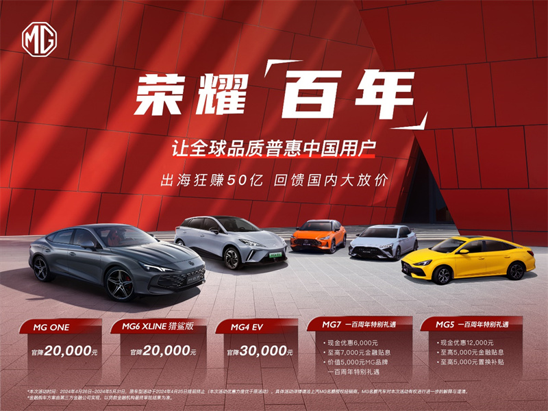此次“榮耀百年”回饋活動, 全球首款電動鋼炮MG4 EV官方直降3萬元,品質潮玩SUV MG ONE和潮能玩家之選MG6 XLINE獵鯊版官方直降2萬元,至美B級轎跑MG7一百周年特別禮遇1.8萬元,MG5一百周年特別禮遇2.2萬元。