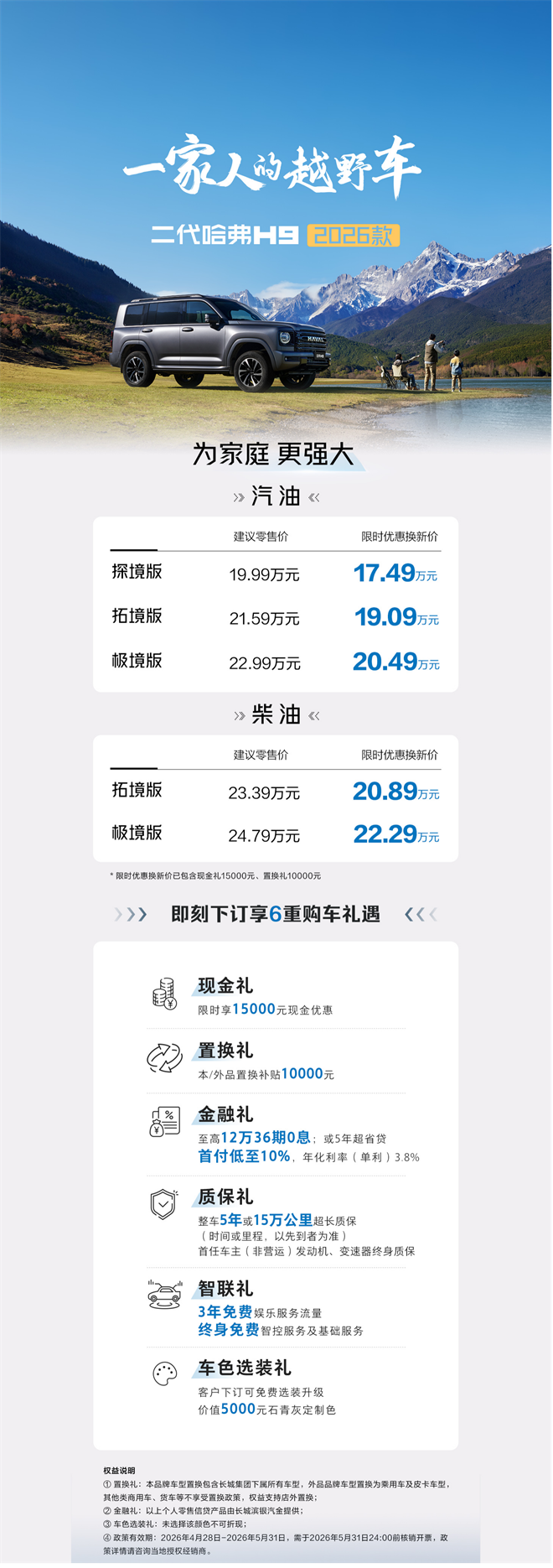 從2014年打破合資壁壘,到2026年重新定義家庭越野,哈弗H9用十年時間完成了一次價值躍遷:它不再只是“能越野的SUV”,而是真正成為了“為家庭而生的全能座駕”。對于每一個想帶家人去看世界的爸爸、每一個想在旅途中給孩子更好陪伴的媽媽來說,這輛車給出的答案,足夠有力。