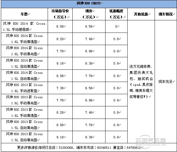 目前,從上海東神公司了解到店內正開“弘仁周年慶,風神脫光價”活動,東風風神H30 CROSS 6.58萬元起,零利促銷,現金直降8000元,更享集團慶典大禮包;特推出5臺車特供版,虧本讓利,限時限量,售完即止!活動詳詢閔行總店:51093068、浦東店:60346511、漕寶店 64780812。詳見下表: