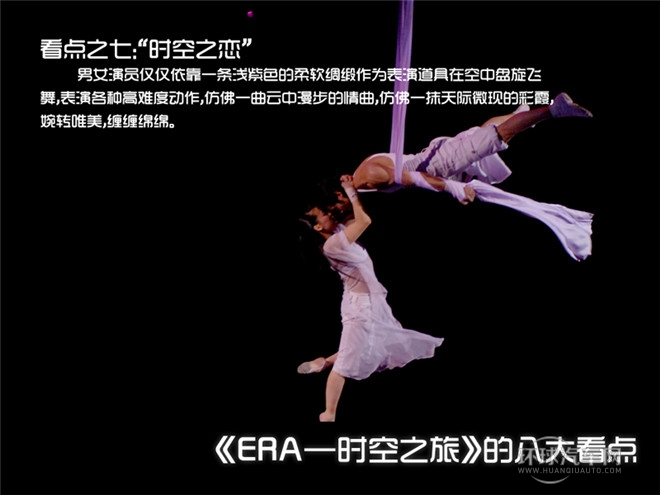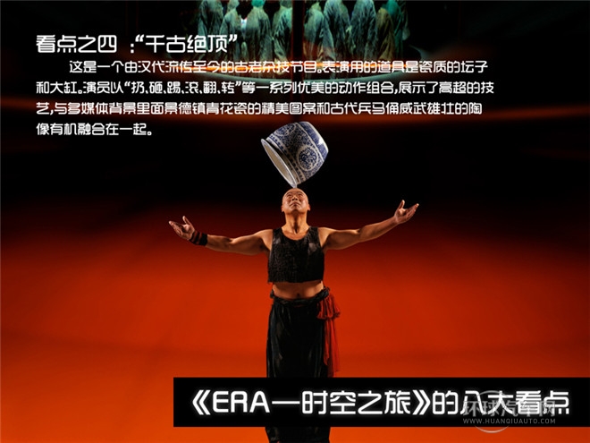 “ERA時空之旅”融雜技、舞蹈、戲劇、音樂和世界一流多媒體技術于一體,中國元素、國際制作,打造全新舞臺藝術樣式,原創音樂、現場演奏、電子投影、數字舞臺、超大水幕、巨型鏡墻,如夢似幻……感人、神奇、震撼,給人以超凡享受,堪稱“中國娛樂第一秀”。