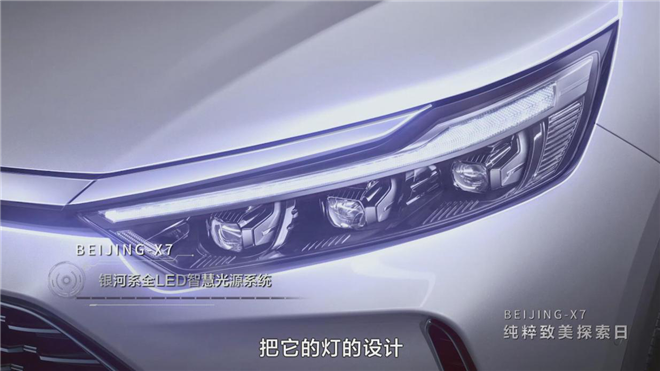 自信的前臉,迎合了當代年輕消費者激進、張揚的個性。BEIJING-X7前臉上部似飛翔的翅膀,象征未來,下部六邊形格柵大氣恢弘。銀河系全LED智慧光源系統與進氣格柵成為一個整體,寓意“飛翔的開放空間”,彰顯自由的同時賦予年輕消費者自信、進取的用車體驗。
