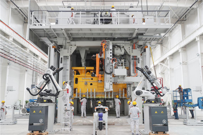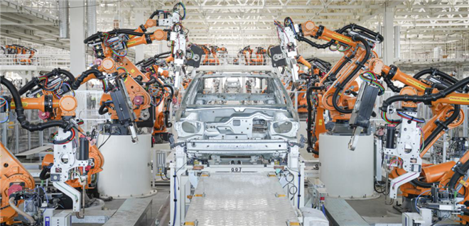 均按照工業4.0標準建設的兩大基地,采用世界最先進的裝備、世界最先進的工藝,實現世界最先進的智能制造,全面達產后能做到每分鐘生產1輛車。目前,基地已全線進入設備安裝調試階段,裝配2545臺智能機器人,通過鏡頭就足以讓人仿佛置身于科幻世界。