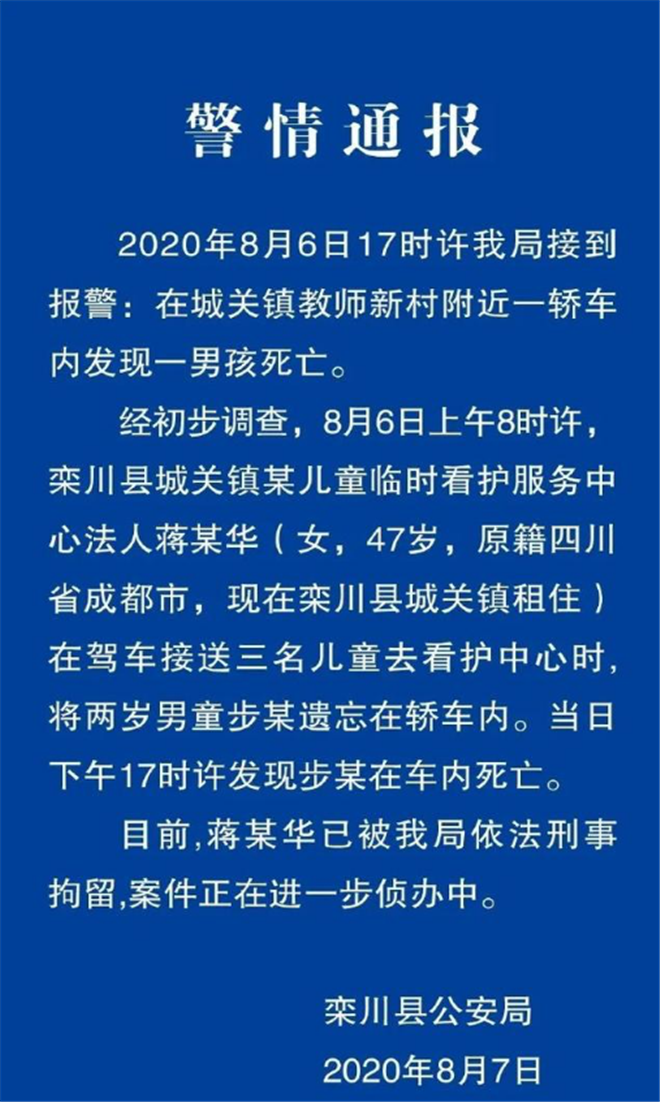 事發(fā)當天早上,輔導班校長蔣某某到學童家中,將兩歲半的學童接往學校。但不知為何,蔣某某將孩子忘在了車內(nèi),直到下午5點才發(fā)現(xiàn)。據(jù)現(xiàn)場目擊者稱,孩子全身發(fā)紫,渾身起有水泡,還有抓痕,死狀凄慘。雖然孩子的死亡原因目前官方尚未給出定論,但根據(jù)目擊者的描述,孩子很有可能是因為長時間處在高溫密閉空間,出現(xiàn)了缺氧、脫水的癥狀,從而導致了死亡。目前嫌疑人蔣某某已被警方刑拘,案件在進一步調(diào)查中。而蔣某某的一時大意,毀了兩個家庭。蔣某某及其家人要承擔后果,而男童的家人痛失孩子,徹骨之痛令人聞之心碎。