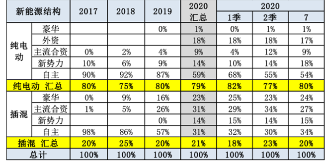 今年,受新冠疫情和經濟下行影響,中國汽車市場整體下滑嚴重,自主品牌的影響大于合資或外資品牌,最直接的體現便是銷量數據。在中國新能源汽車市場,自主品牌的純電動車型市場承壓。相對于2019年自主品牌占純電動車87%的份額,今年7月自主品牌僅有54%的份額,1-7月的份額也僅為59%。