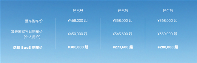 選擇BaaS模式購買蔚來全系車型,車輛售價將減少7萬元,選擇70kWh的電池包,每月服務費980元,非服務無憂用戶另須支付每月80元電池保障費用。