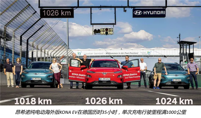 根據當前純電續航里程的躍進幅度看,2018年主流里程是450公里,2019年主流里程是500公里,今年主流里程是550公里......而在全球范圍的實際測試看,昂希諾純電動的海外版現代KONA EV已經跑出了1000公里純電續航里程的驚人成績。