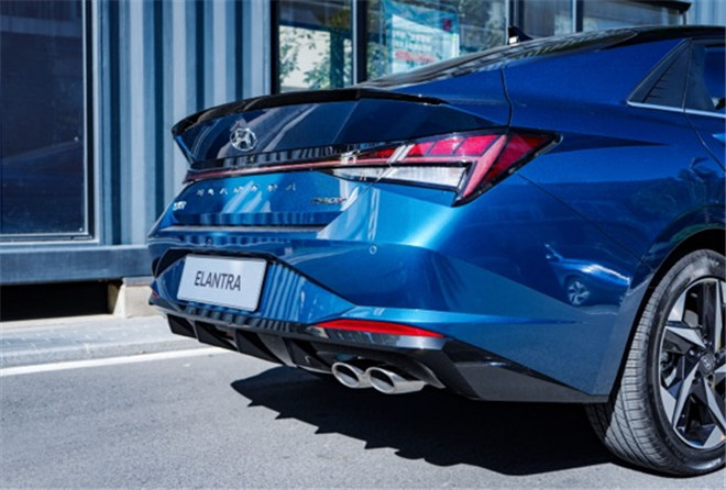 看完前臉和側面,不禁感嘆第七代伊蘭特這次真的是有備而來,然而驚喜不止這些,在車尾部分同樣大有看點。在車身尾部,第七代伊蘭特采用了同級獨有的“H”型貫穿式設計尾燈,尾燈組內運用眾多楔形元素,頗具層次感,不僅有警示后車的作用,還能提升觀賞美感。此外,1.4T車型還配備了單邊雙出的排氣布局,黑色小擾流板加上略顯夸張的“擴散器”,太拉風了。