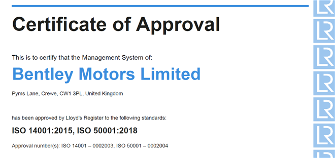 賓利汽車獲得最新 ISO 能源及環(huán)境管理體系認(rèn)證