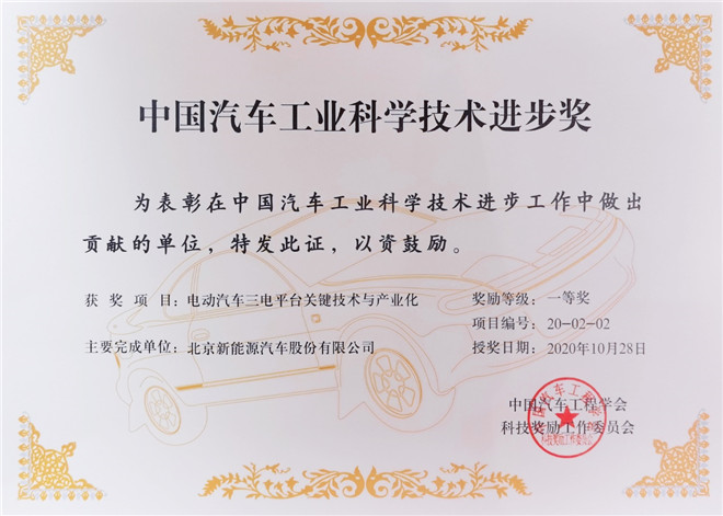 10月28日,2020年度“中國汽車工業科學技術獎”獎頒獎典禮在上海舉行,北汽藍谷子公司北汽新能源“電動汽車三電平臺關鍵技術與產業化”項目獲評中國汽車工業科技進步獎一等獎。這是繼2018年、2019年后,北汽新能源連續三年獲得“中國汽車工業科學技術獎”殊榮。