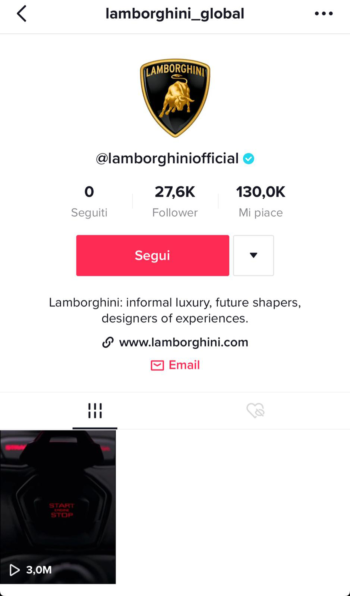 蘭博基尼汽車公司在主流社交網絡上擁有強大的影響力,龐大且仍在快速增長的粉絲數量也是蘭博基尼對社交媒體傳播極為重視的體現。Instagram是蘭博基尼最為成功的社交網絡平臺,粉絲數量在短短一年內從2,300萬增長到2,800萬,蘭博基尼也成為Instagram上最受歡迎的超級豪華跑車品牌。蘭博基尼在Facebook上擁有1,290萬粉絲,在YouTube上的粉絲數量也從110萬增長到目前的160萬。現在,蘭博基尼將通過入駐TikTok平臺繼續推進其戰略和增長目標:在發布第一條TikTok視頻的首個周末中就收獲了高達300萬的觀看量和27%參與率的傲人成績。