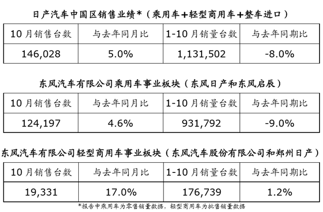 輕型商用車事業板塊(包括東風汽車股份有限公司和鄭州日產)10 月銷量為 19,331 臺, 同比增長 17.0%。其中,東風汽車股份有限公司和鄭州日產 10 月銷量分別為 15,260 臺和 4,071 臺,同比分別增長 18.1%和 13.2%。
