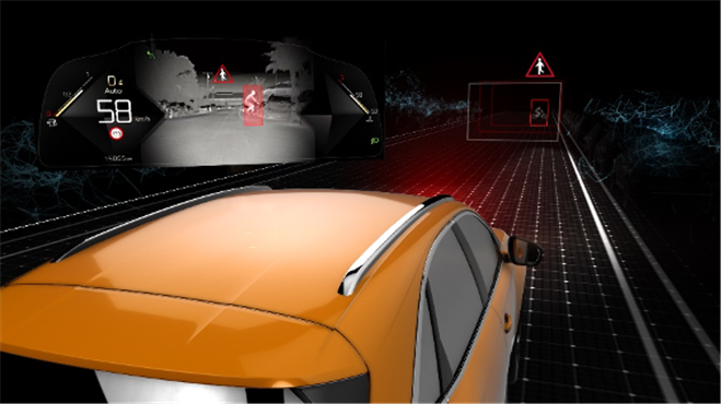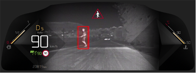 DS 7的前格柵中暗藏著一顆紅外攝像頭,配合先進的人工智能(AI)技術,使車輛能夠在任何速度下識別15米至150米之間,位于主干道及兩側區域的行人和動物,并實時分析其活動情況。當物體尚未進入駕駛者的視野時,物體輪廓圖像就將清晰地呈現于全液晶高清儀表盤上,當存在潛在危險時,物體將會被標以黃色方框,而隨著危險等級的提升黃色將會逐漸變為紅色,并配合系統發出的聲學警報提醒駕駛者,以便駕駛者作出更及時的應對。