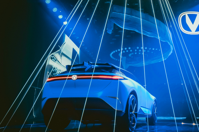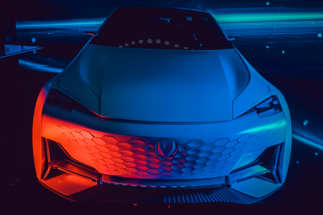 在現(xiàn)場(chǎng),我們見到了長(zhǎng)安Vision-V概念車,它應(yīng)用了生命動(dòng)感2.0設(shè)計(jì)理念,前臉采用了無(wú)邊界格柵造型,中網(wǎng)的菱形元素營(yíng)造出一種無(wú)限延伸但又不斷融合的獨(dú)特造型,上方則是充滿科幻風(fēng)格的狹長(zhǎng)銳利橫置前大燈,前臉的格柵會(huì)根據(jù)行人靠近的距離顯示不同位置的亮光,整個(gè)前臉不僅充滿了科幻范兒,更具有別具一格的視覺(jué)感染力。