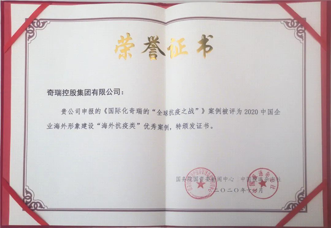 在此次獲得“中國企業海外形象20強”的同時,由奇瑞集團申報的《國際化奇瑞的“全球抗疫之戰”》案例,還被國務院國資委新聞中心評選為2020中國企業海外形象建設“海外抗疫類”優秀案例。