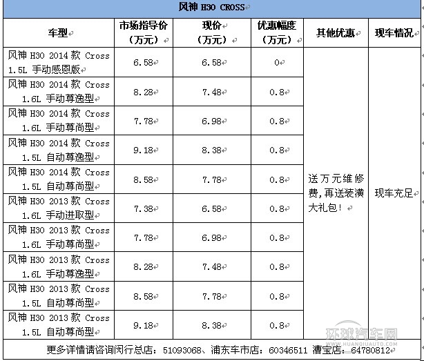 目前,從東風風神上海東神汽車了解到,店內風神H30 CROSS現金讓利8000元,送萬元維修費,送裝潢大禮包!詳詢閔行總店:51093068、浦東店:60346511、漕寶店 64780812。詳見下表:詳見下表: