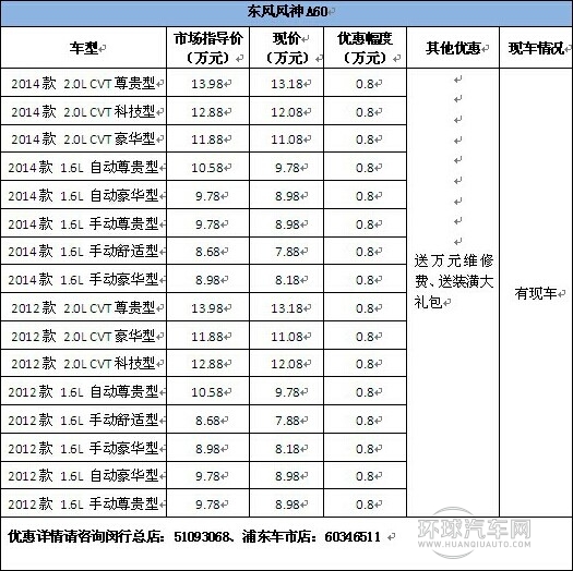 目前,從東風風神上海地區建店規模Z大、網點分布Z全、管理內風神保有客戶Z多的上海東神4S店了解到,店內東風風神A60全系現金直降8000元,送萬元維修費,再送裝潢大禮包!另,老客戶轉介紹新客戶,送老客戶千元現金或油卡獎勵,新客戶送禮上禮。活動詳詢閔行總店:51093068、浦東店:60346511。詳見下表: