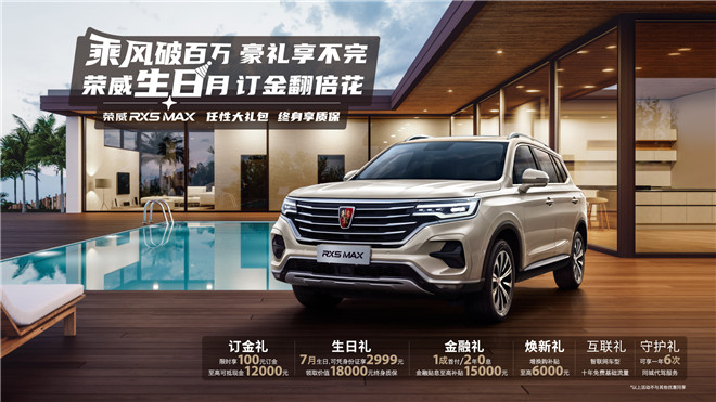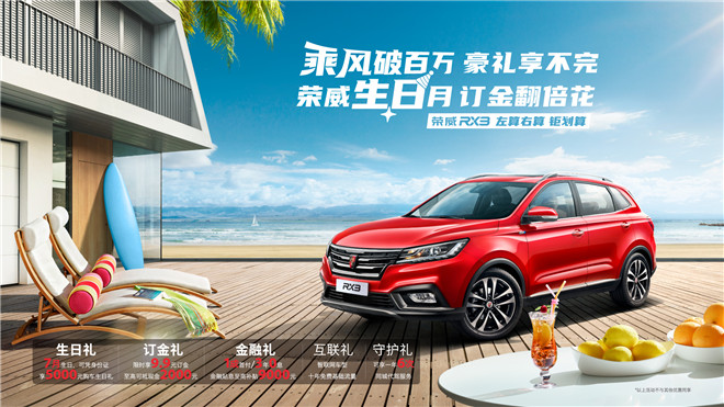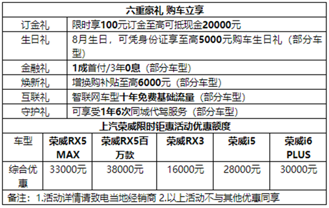 為慶祝互聯網汽車銷量突破百萬大關,上汽榮威在“榮威寵你 月月有禮”用戶關懷計劃之后,再次加碼推出“乘風破百萬 豪禮享不完 榮威生日月 訂金翻倍花”的限時大促活動。即日起至8月31日,凡是8月生日的用戶(包括購車人親朋好友),購買榮威RX5 MAX、榮威RX5百萬款、榮威RX3、榮威i5、榮威i6 PLUS等任一款產品,均可享受巨額綜合優惠。實惠和福利參見下表: