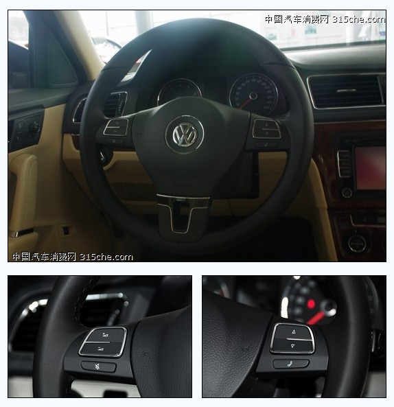 真皮包裹的三幅式方向盤采用與新款帕薩特相似的設計,真皮包裹并配有音量調節和藍牙功能,多功能按鍵手感有點偏澀。另外,方向盤只能進行手動兩向調節,正常身材的駕駛者都能找到適合自己的坐姿。